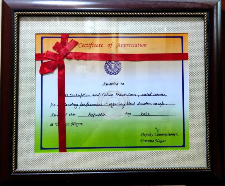 Certificate of appreciation by Deputy Commissioner of Yamunanagar to ACCP for social service & impactful grassroots initiatives in Yamunanagar, Haryana. A proud acknowledgment from the district administration for our consistent on-ground efforts.